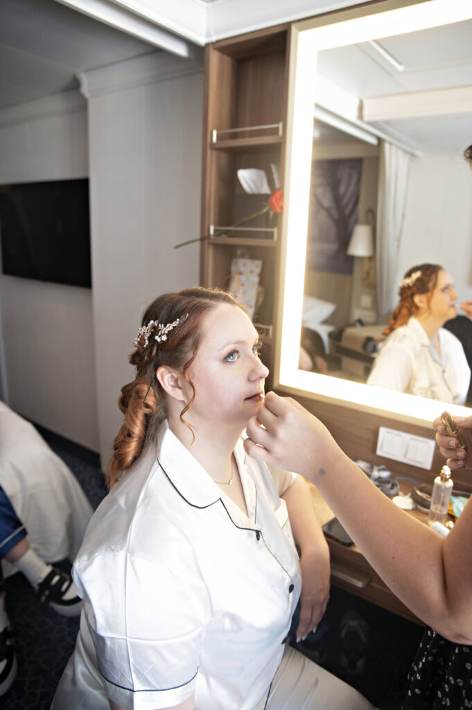 Instead of a traditional venue, their wedding day unfolded across the ship itself. Guests gathered in the stunning Grand Hall atrium for the ceremony, surrounded by sweeping staircases, glowing chandeliers, and the soft buzz of excitement that fills the ship on wedding days.
